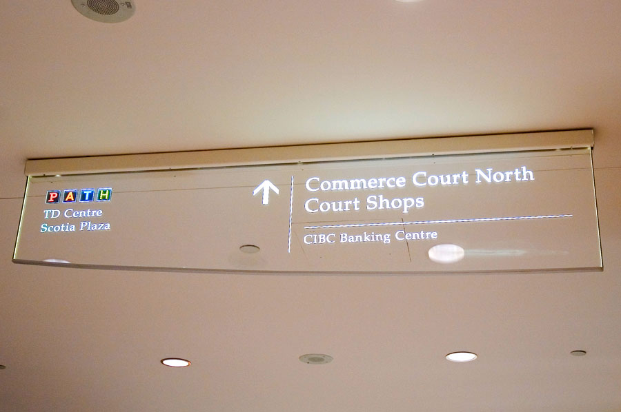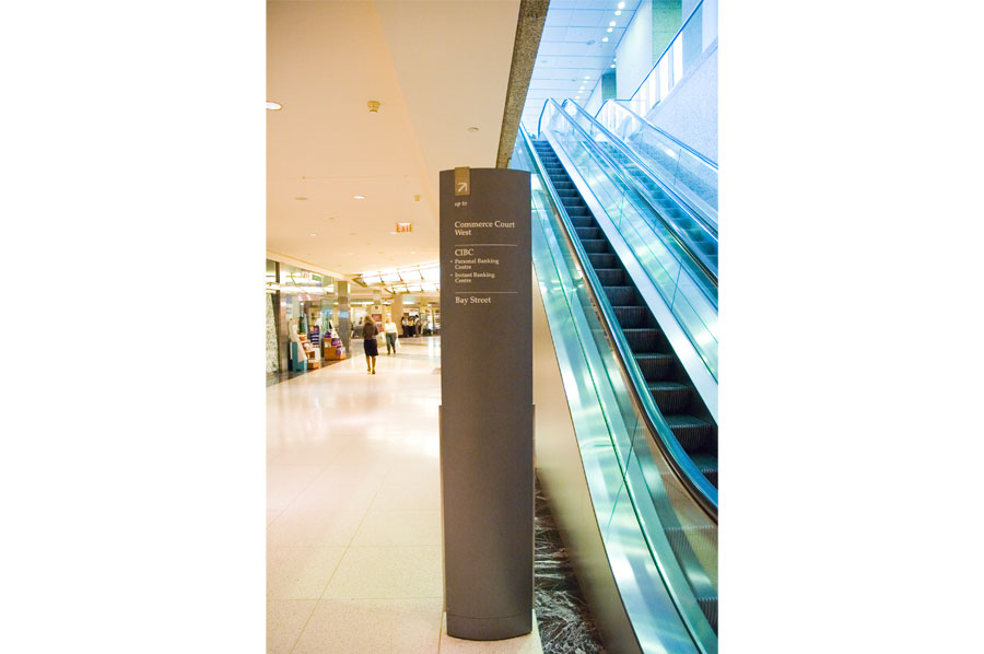 Highlights: Building identification on main entrances are waterjet cut, stainless steel, pin mounted graphics. The Site Identification sign is a 48 inch diameter, double sided internally illuminated Commerce Court Logo. Computerized touchscreen directories are kiosk type, built with 3/16 inch thick painted aluminum with pewter metallic finishes and incised acrylic backlit maps. Touchscreen monitors feature removable 3/16 inch transparent bronze tempered glass. Pylon way-finding signs and direction signs are both duracron and stainless steel with aluminum reveals. For the way-finding pylon signs, text graphics are etched/engraved and filled with the arrows being incised 3/16 inch stainless steel. Hanging Signs throughout the underground court are 3/16 inch edge lit acrylic featuring full colour PATH system identification and mounted flush to the ceilings.