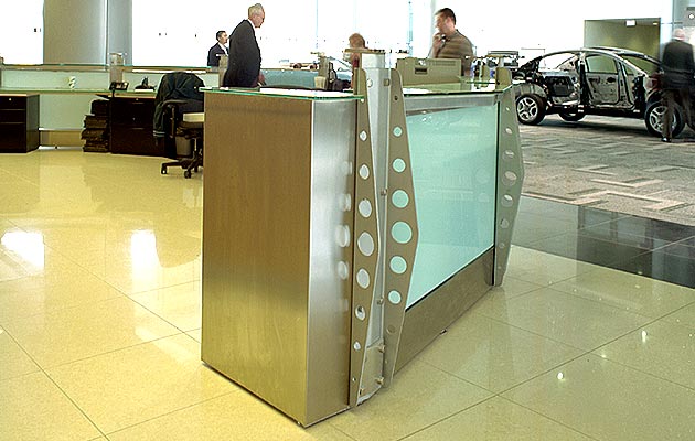 Highlights: Soheil Mosun Limited was asked to design and value engineer the reception desk to reduce the cost of this item by forty percent from the original awarded price. Our team met this target budget and produced a more attractive and efficient design from the original intent, far exceeding our customer's expectations.