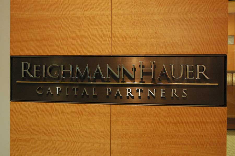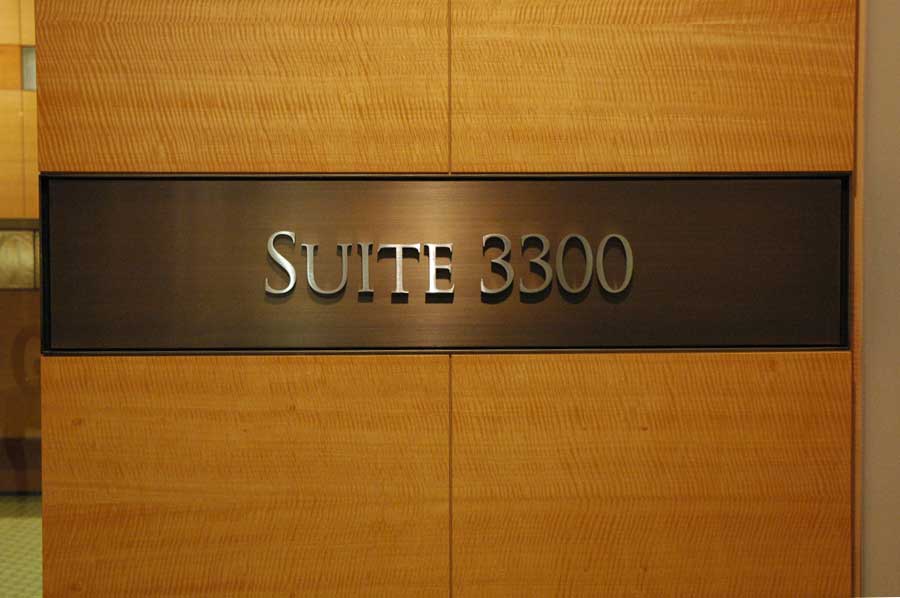 Highlights: The letters were water-jet cut from 1/2" and 1/4" thick stainless steel sheet, then combination finished; utilizing both mirror and brushed treatments. The 1/4" square bronze divider line was also brought to a mirror finish, then 24 carat gold plated. All graphics are pin mounted to the solid bronze panel which has been patina finished to its deep chocolate colour.