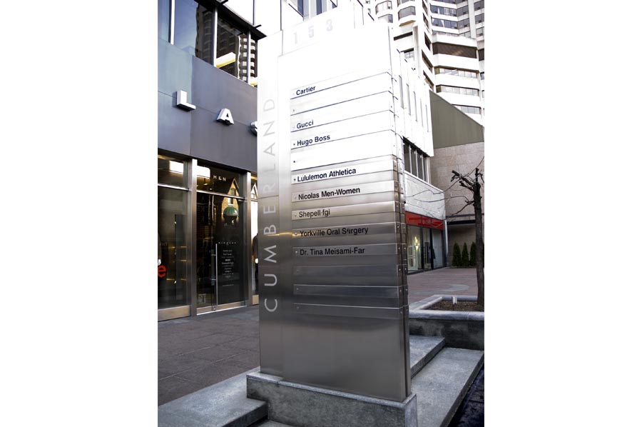 Scope: Soheil Mosun Limited was contracted to design, fabricate and install the 11'x4' stainless steel building and tenant identification pylon sign at 153 Cumberland Avenue in Toronto's Yorkville district.