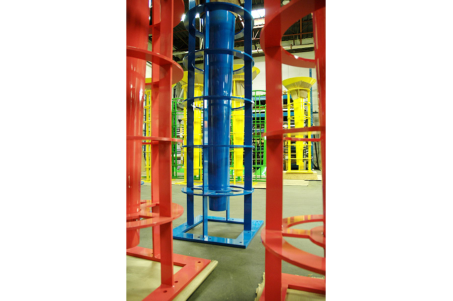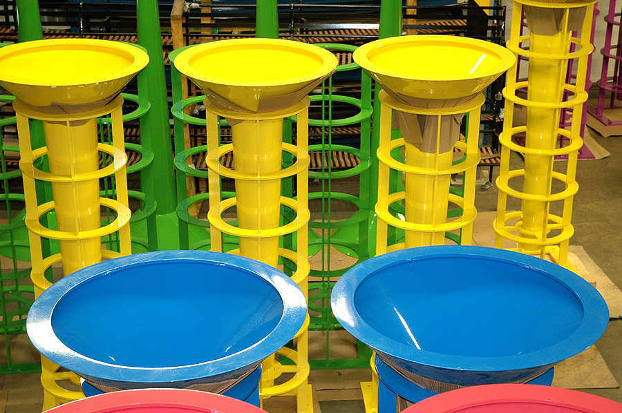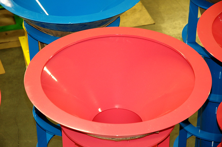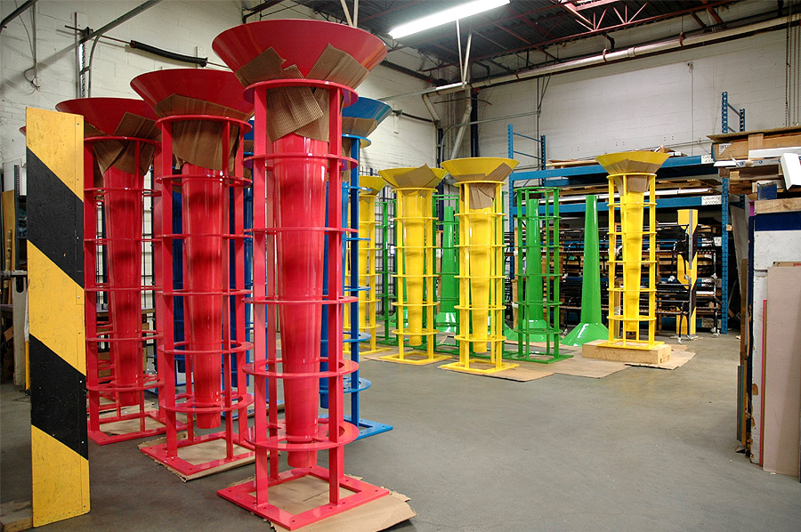 Highlights: Each 2.3 meter tall structure was fabricated from (2) seamlessly welded spun aluminum cones and features (5) waterjet cut rings - designed for aesthetics and support. The structures are powder coated in traditional Barbadian colours.