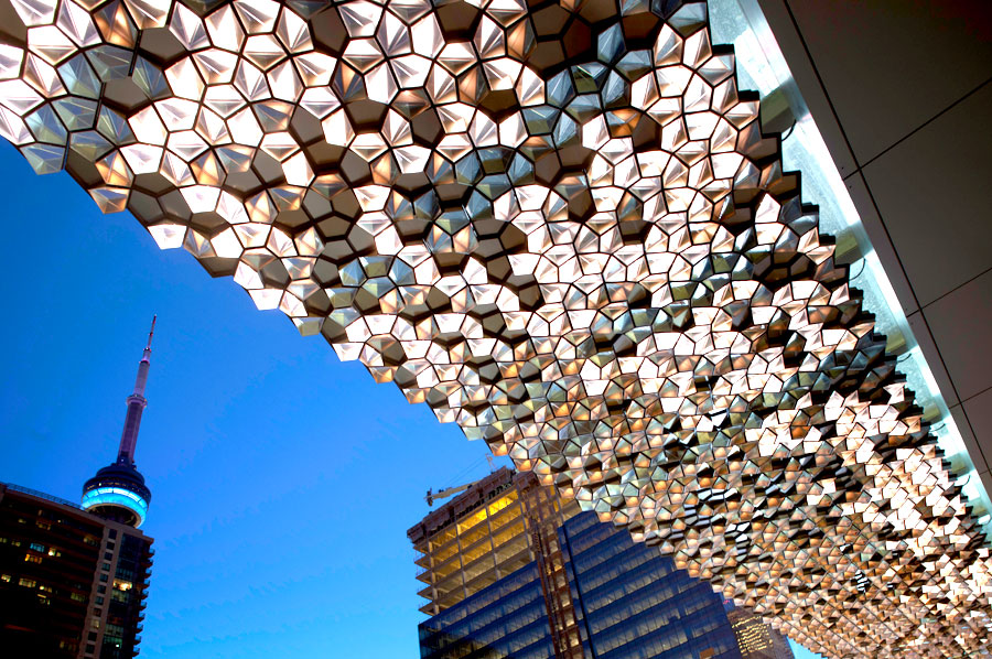 Scope: Soheil Mosun Limited was contracted to design build, engineer, manufacture and install this illuminated canopy and work of public art at Maple Leaf Square in downtown Toronto.