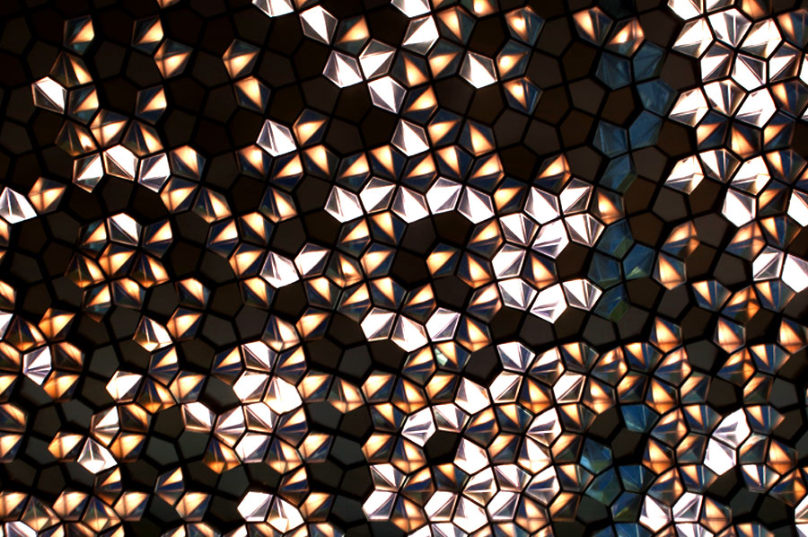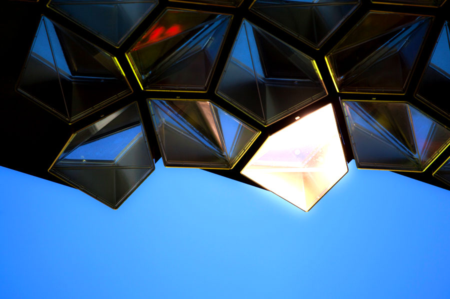 Highlights: The canopy uses modular units which are frame mounted to hold each individual LED and lens component. There are 8200 modules overall that display a synchronized pattern through use of computer controlled digital signal output. The canopy is suspended by stainless steel cabling system beneath 1/4" thick glass panels. The framework is powder coated steel and the modules are anodized aluminum extrusions with each module placed individually into the framework. The canopy is approximately 300' long and 10' wide.