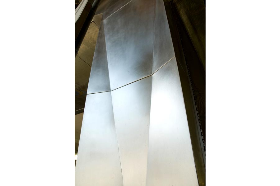 Highlights: The supporting structure beneath the cladding is comprised of galvanized steel angle tube clamped without driling or welding to the existing bridge structure. All hardware fastening is stainless steel. The exterior cladding is alloy 316 exterior high grade 16 Gauge stainless steel with a non-directional orbital finish. Cladding is mechanically fastened and welded to the underlying framework with no visible fasteners. The cladding is formed in a diamond shaped angular shape in both concave and convex formation. Perforated access panels wrap to the inside of the underpass and elegantly hide the various mechanical necessities while allowing for water drainage.