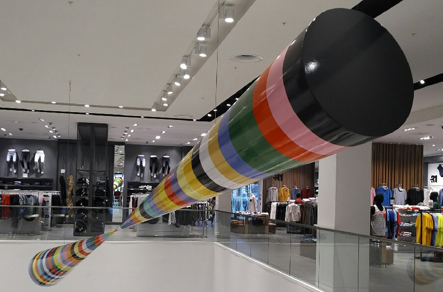 Scope: This Public Art project was produced for famous Canadian novelist, artist and one of Canada's foremost cultural figures Douglas Coupland. It was commissioned for the Simons department store at the Park Royale Shopping Centre in West Vancouver. The art piece known as "Bowtie" consists of (2) 18'-0" long x 48" in diameter cones (at the large end), fabricated from 1/4" fiberglass over an aluminum structural frame.