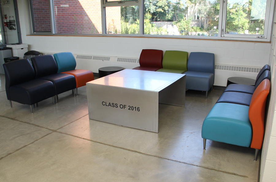 Highlights: The table is 1/8" alloy 304 stainless steel in a single piece, formed, then etched, infilled and orbital brush finished. It has the etched names of all the students and teachers for the graduating class of 2016 around the delineated border of the table, separated by etched dots and within an etched border. The table is 48" square and 23.5" in height. The letters are 2 1/2" high on the main text "Class of 2016" and the school logo is 6" wide and approximately 8" in height, etched and infilled in the schools deep blue colour.