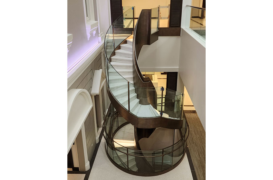 Scope: Soheil Mosun Limited was commissioned to design-build, supply and install this three (3) story custom eliptical staircase with patinaed bronze cladding, custom patinaed railings and glazing, for the main atrium of the Butterfield Bank, headquartered in Hamilton, Bermuda.