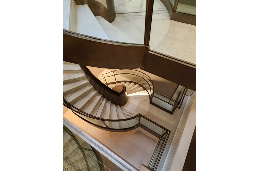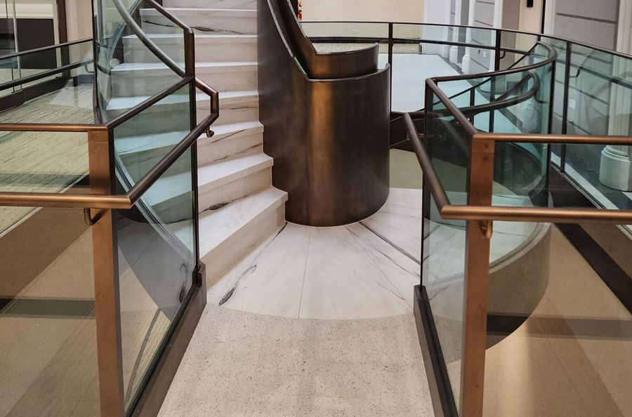 Highlights: Structural steel staircase clad with SML-C3 patinaed muntz bronze inside and outside of stringers. 168’ of railings are patinaed bronze and secured with custom built fasteners secured to posts and glazing. Structural steel components were 3D modeled and templated in shop and shipped to Bermuda for installation. Cladding is .050” Muntz Bronze cut and formed to the staircase. Stone treads and risers are comprised of white marble.