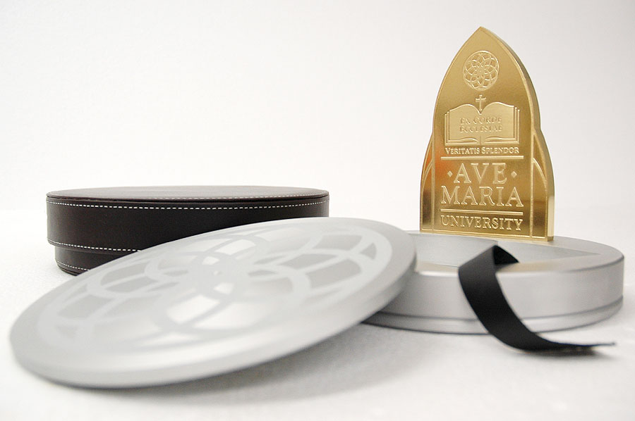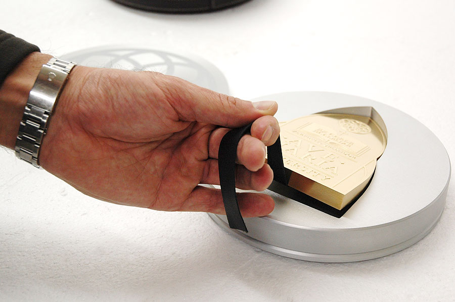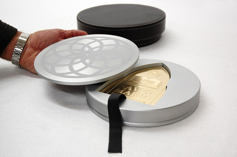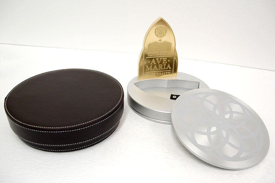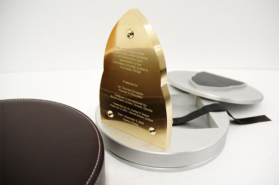 Highlights: This exquisite custom piece was waterjet cut from 1/2" thick solid bronze plate. The logo on the front was acid etched, while the inscription on the back of the paperweight was engraved using the three-dimensional machining centre. The final process was 24-karat gold plating. The accompanying metal holder was machined from a solid block of aluminum and features a beautiful watermark etched crest and gold plated feet, all complimented with a striking handmade leather carrying case.