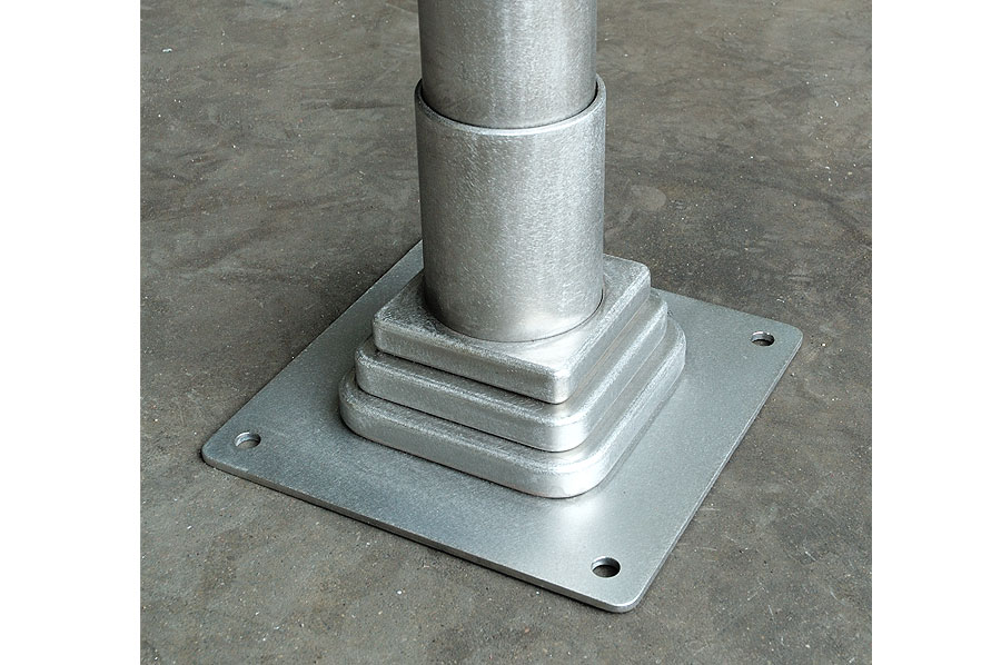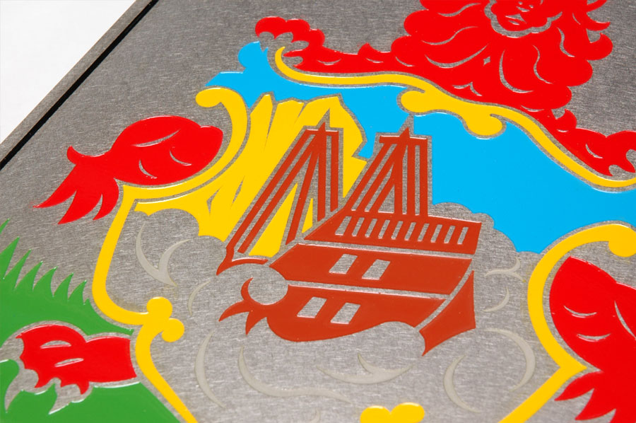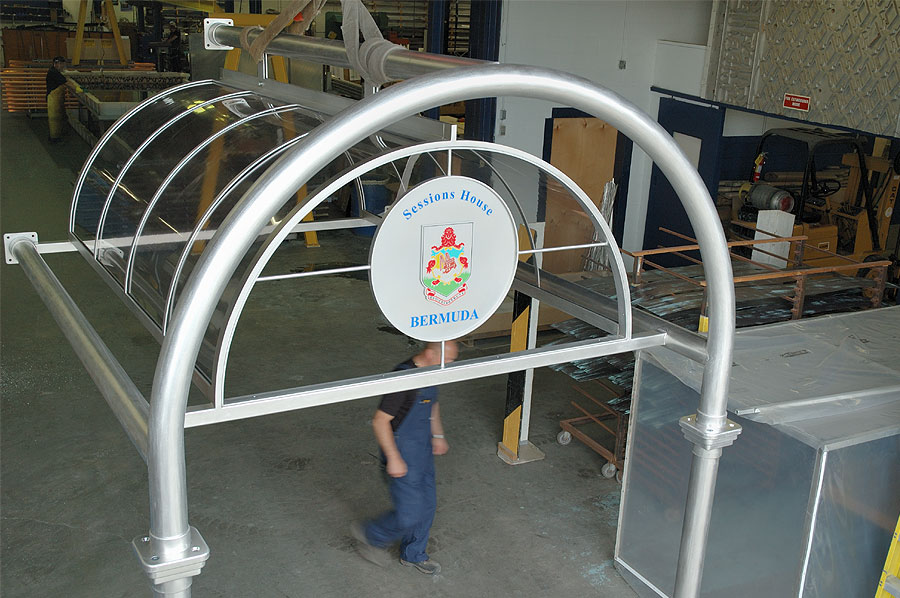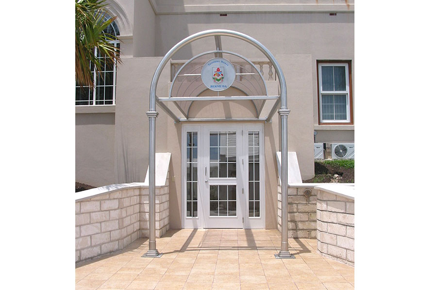 Highlights: The canopy is made of 316 St. Stl. alloy with orbital brushed finish and glazed with 3/8" thick rolled Lexan panels using minimal fasteners. The front of the canopy is accented with a complex, waterjet cut, etched and multi-coloured infilled crest on a suspended St. Stl. plate. The structure was designed to withstand varying Bermuda weather conditions.