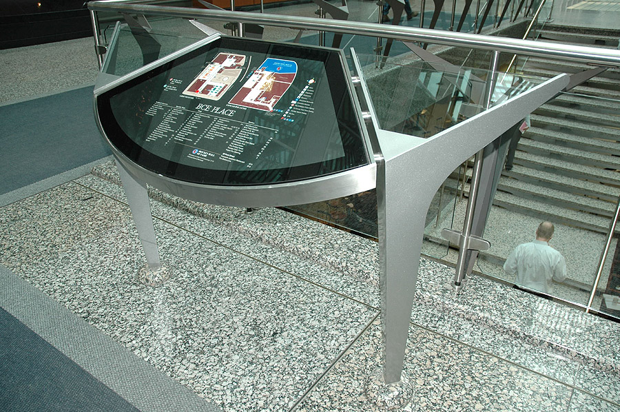 Highlights: The flat wayfinding directory found upon entering from Bay street is made of brushed stainless steel frame structure. The concourse retail directory is made of a brushed st. stl. arch frame - both are equipped with internally illuminated sign face graphics. The individual letter identification is made of waterjet cut 1/8" thick mirror polished st. stl. letters mounted onto 1/4" thick waterjet cut black anodized aluminum letters. The total signage package program smoothly integrates into the buildings' architecture.