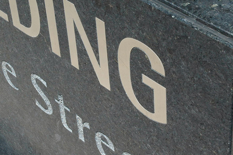Scope: Soheil Mosun Limited was commissioned to manufacture and assemble (1) custom granite ground sign with waterjet cut, brushed stainless steel incised lettering and precision carved graphics.