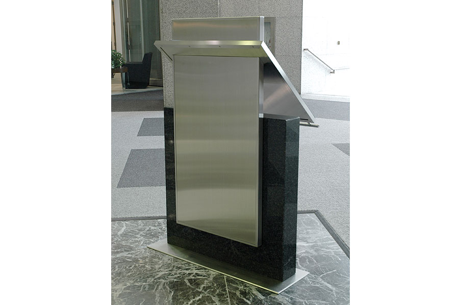 Highlights: Directories utilize a welded steel sub-frames, with Nero Impala black granite cladding at the bottoms, stainless steel cladding at the tops, and cantilevered clear glass faces protecting full-color printed maps and tenant information.