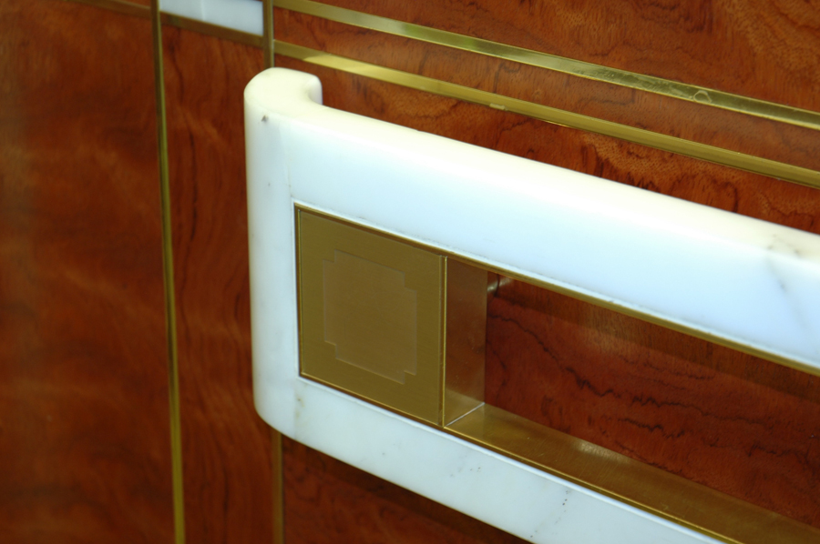 Highlights: Drop ceiling fabricated in two types of marble with polished brass inlays and back-lit with compact fluorescent lighting as well as recessed down lighting. Rear and side wall panels fabricated with 'Bubinga' veneered wood paneling with polished brass inlays. Flooring made from custom water-jet cut shaped marble tiles complete with polished brass inlays. Doors clad in polished and lacquered bronze.