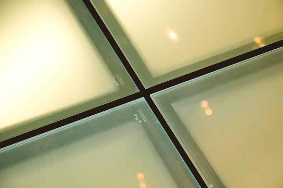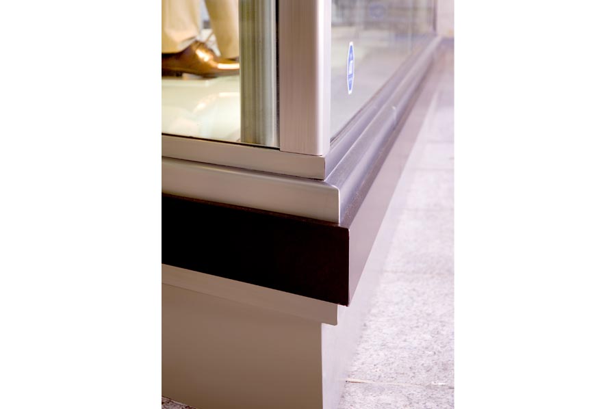 Highlights: The Exterior Display Case features formed, anodized aluminum band signage and stainless steel corner guards, posts and ceiling panels. Glass walls are 1/2'' thick with stainless steel shoes, locking mechanisms and hinges. Glass floor is frosted and tempered and serves to diffuse the light source from below. Ceiling is stainless steel paneling that features directional inset lighting that can be configured to suit the display.