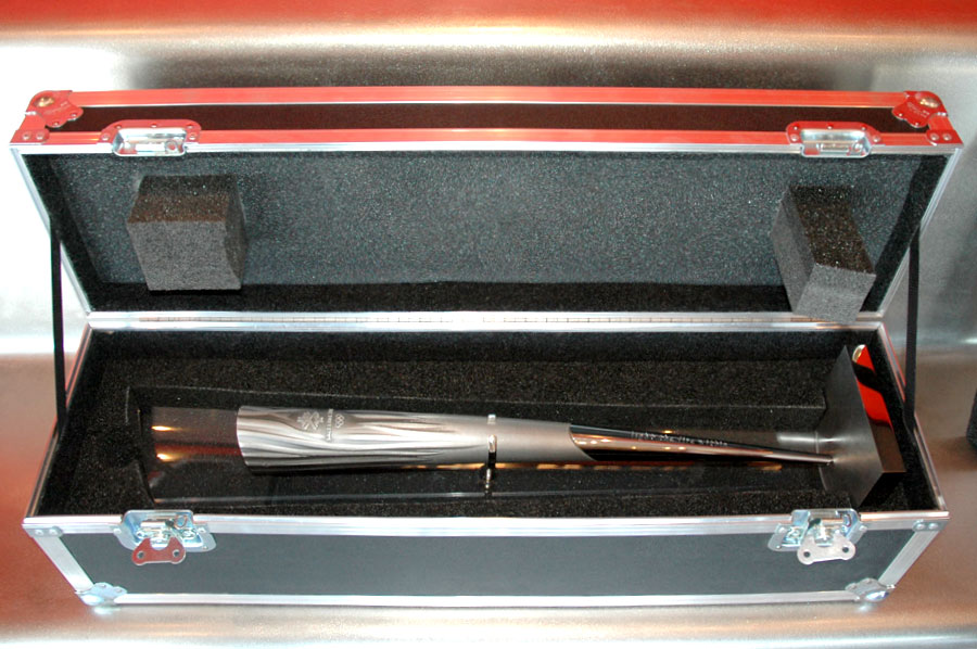 Highlights: These Olympic Torch Stands feature cut and formed acrylic at 1/4" thickness with stainless steel base and footings. A stainless steel pin is placed at the bottom to secure the torch vertically, while midway up the acrylic there is a custom stainless steel ring to hold the torch horizontally in place. Finish is a mirror polish on top and all sides. Heavy duty ATA style cases with 1/4" black laminate featuring cut and contoured foam insets and aluminum crossbars were included for travel and storage of the stands when not on display.