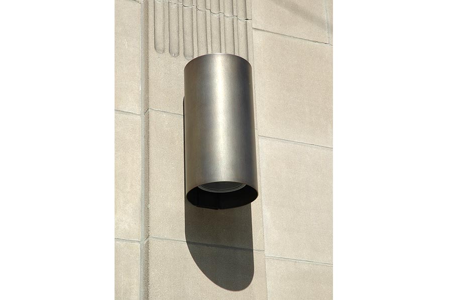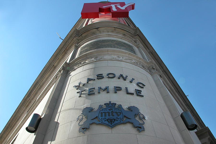 Highlights: The temple name, replicating the original sign letters in size and position on the prominent curved corner of the building, was waterjet cut from 1" muntz bronze. The MTV crest and logo was waterjet cut from 1/4" muntz bronze, engraved with our 3DMS and rolled to match the curvature of the building. Both the letters and crest were pinned mounted off the face of the building. The wall sconces, fabricated from 1/8" muntz bronze, were rolled and machined to a size of 18" tall and 9" in diameter. All of the bronze was finished in a dark statuary patina finish with no sealer. The bronze will continue to darken over time and attain an historic finish.