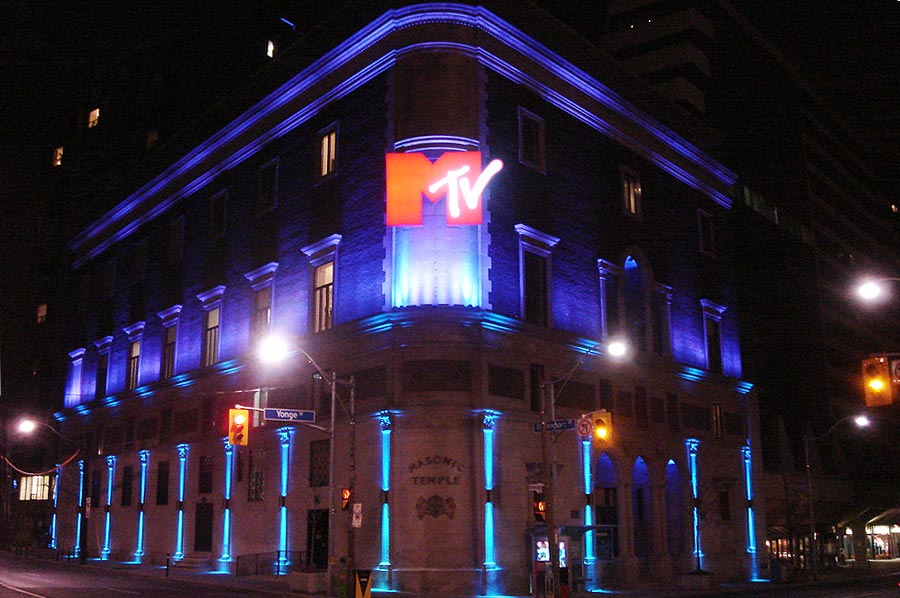 Scope: The project consisted of (3) elements, the Masonic Temple name, the MTV crest with logo and (12) tall cylindrical wall sconces providing both up and down wall washing illumination. These features were designed to convey the iconic character of this Toronto landmark and Heritage building.